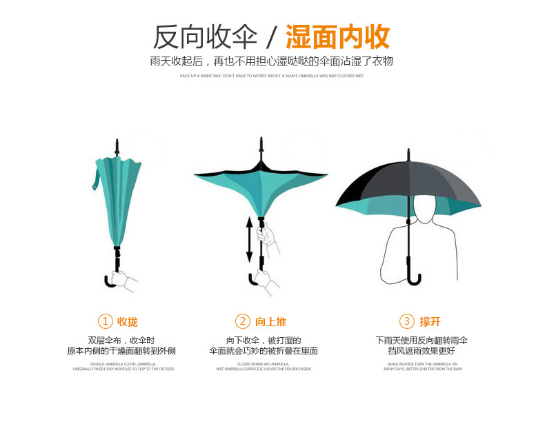 顧名思義(yì),反向傘是一把(bǎ)反(fǎn)方向開傘的雨傘。最大的特點就是顛覆了傳統(tǒng)雨傘的開傘方(fāng)式從由裏到外到由外到裏。 那這個(gè)傘有什麽優點呢?