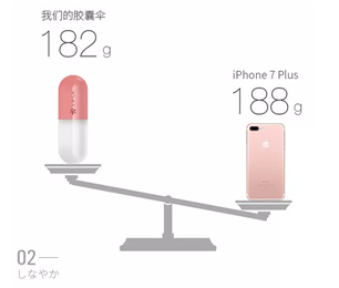 我們的膠囊傘輕至182g,僅相當於一部iphoness手機的重量,為您夏季(jì)減輕負擔。