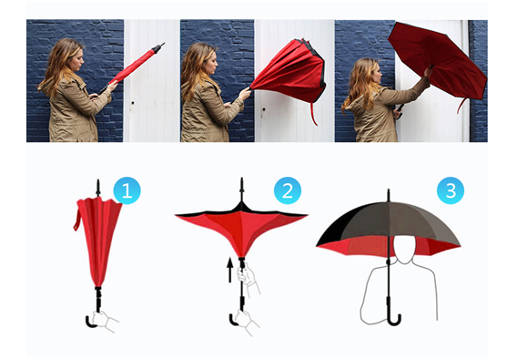 這款反向傘是在2015年研發出來的,並於該年年底正式投產。這款雨傘的三大優點是: 1、改良了傳(chuán)統雨傘收(shōu)傘(sǎn)時需(xū)要很(hěn)大空間,尤其是上車的時(shí)候,人未上(shàng)車就先弄濕了; 2、改良了傳(chuán)統雨水收(shōu)起後雨(yǔ)水到處滴水,也就是濕麵朝外,而且經常容(róng)易弄濕衣物和文件(jiàn); 3、改良了傳統(tǒng)雨傘在狂風暴雨時(shí)傘骨容易被吹反,人一下子就濕了的尷尬情況。