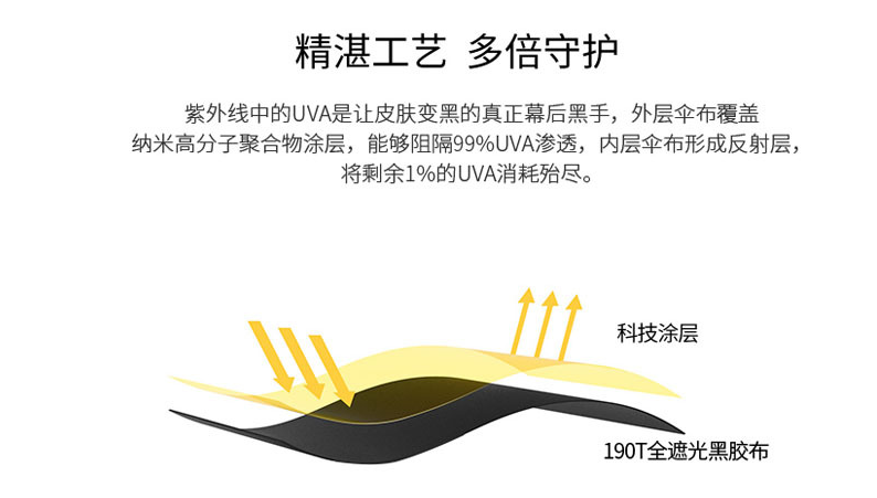 一般的防紫外線雨傘怎麽區分(fèn)它的好與不好(hǎo)呢?其實(shí)業內早就清楚,防曬(shài)塗層效果最好的是黑膠,其中以全遮光黑(hēi)膠是最好的,其次是半遮光黑膠與銀膠相差不是很多,最後是色膠。 一把(bǎ)好的遮陽傘能夠為(wéi)我們的小(xiǎo)姐姐們阻擋掉99%的紫(zǐ)外線,讓你整個夏天從頭白到尾。俗話說的好(hǎo):一白遮百醜,一胖毀所有啊。