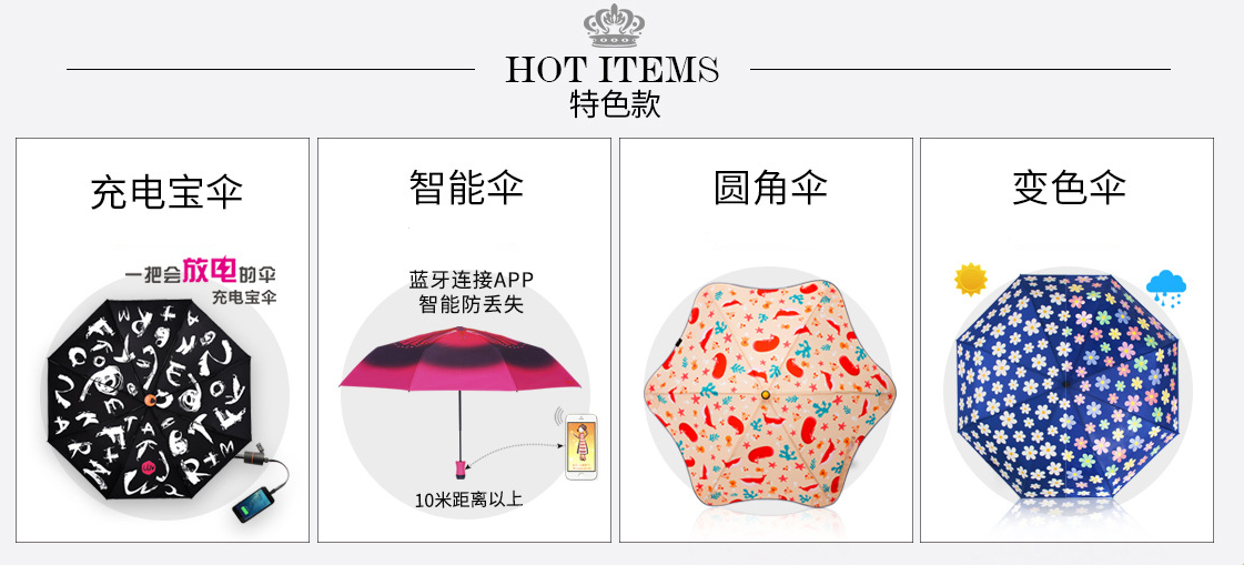 她率先同行開發出充電寶傘、智能傘、圓角傘、變色傘,現又開發出一款一甩幹(gàn)雨傘,為解決下雨天雨傘(sǎn)濕身的煩惱。
