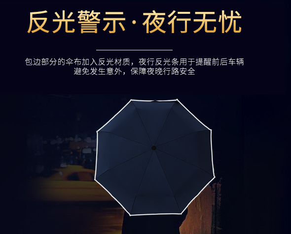 非常實用的三折手(shǒu)開傘,還帶有(yǒu)反關邊條(tiáo),夜間出行更(gèng)安無憂,質量好同時使(shǐ)用壽命長,重量相對來說(shuō)也是(shì)超輕,非常適合大眾需求。