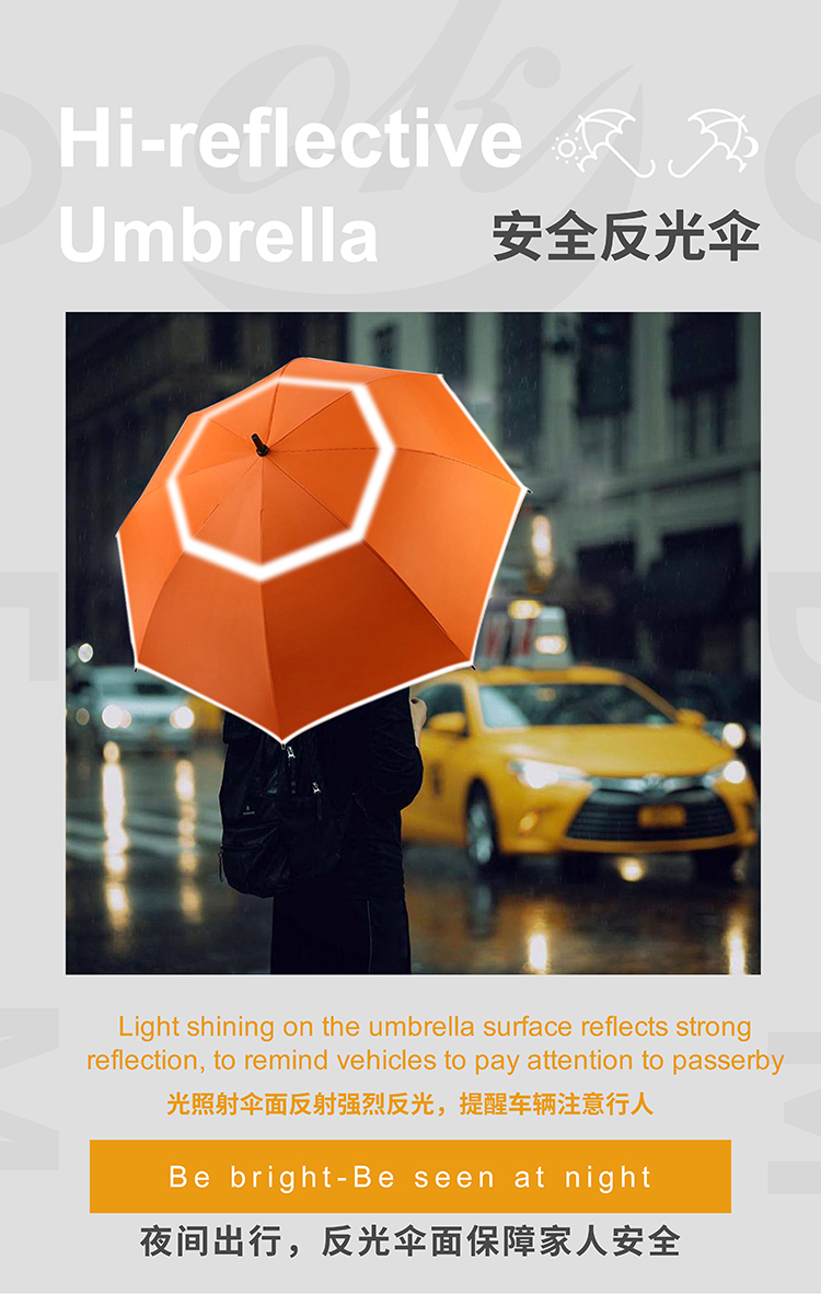 夜間出行的安全問題(tí)越來越(yuè)受到(dào)消費者的關注,而這款單安全反(fǎn)光圈的雨傘,如天使環般時刻嗬護和報障大(dà)家(jiā)的出行安全。