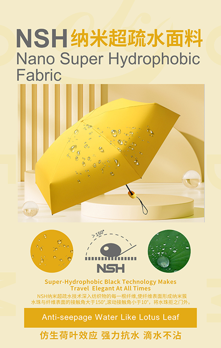 NSH納米超疏水技術是麻花星空无限mv傘業經過多年研發,在原有的納米疏水技術的基礎上研(yán)發、改進的納米技術。