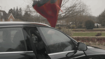 隻能迅速地先收傘、再進車, 即便動作再快, 也還是要淋一身。