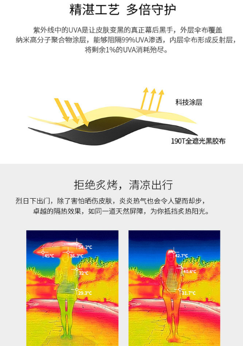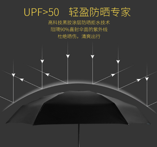 除了又輕又小以外,遮雨遮陽技術方麵也是很有考(kǎo)究的。甄選高密度超(chāo)強防水(shuǐ)碰擊布,還(hái)有(yǒu)高密度黑膠塗層,防曬效果倍兒棒(bàng)。給你的晴天和雨天更多嗬護!